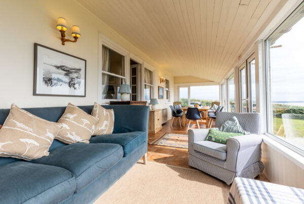 The accommodation is comfortably furnished and comprises five bedrooms, kitchen, bathroom, and two further shower rooms, all with loos. A carpeted sitting room, with a wood-burning stove, leads onto a long verandah overlooking the sea providing sea-view dining and sitting areas.